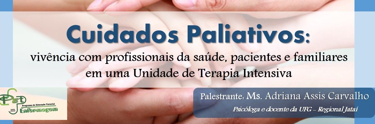 O PET Enfermagem UFG/Regional Jataí convida acadêmicos e profissionais da área da saúde a participarem de mais um AtualizaPET organizado pelo grupo. A palestra Cuidados Paliativos: vivência com profissionais da saúde, pacientes e familiares em uma Unidade de Terapia Intensiva será proferida pela psicóloga e docente Regional Jataí Adriana Assis Carvalho, no dia 29 de março, às 19h15, na sala 14, do Bloco III, na unidade Riachuelo.