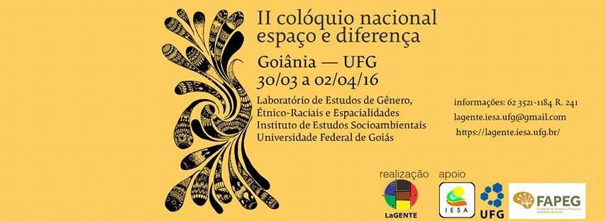 O Laboratório de Estudos de Gênero, Étnico-raciais e Espacialidades (LaGENTE) promove, a partir do próximo dia 30 de março, a segunda edição do Colóquio Nacional Espaço e Diferença. O evento é uma iniciativa do laboratório, com apoio do Instituto de Estudos Socioambientais (IESA), da Universidade Federal de Goiás (UFG), do Programa de Pós-Graduação em Geografia (PPGEO) e da Fundação de Amparo à Pesquisa do Estado de Goiás (FAPEG).