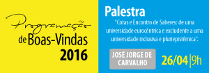 Na próxima terça-feira (26/04), será realizada no Auditório Prof. Lauro de Vasconcellos, das Faculdades de História, Filosofia e Ciências Sociais, no Câmpus Samambaia, a quarta atividade da Programação de Boas-Vindas 2016 da Regional Goiânia, com o professor da Universidade de Brasília (UnB), José Jorge de Carvalho.
