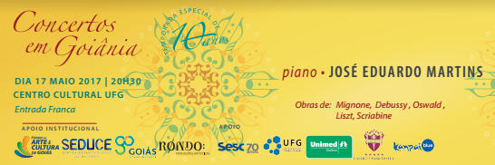 O Concertos em Goiânia, em continuação à comemoração de dez anos, traz a capital goiana o renomado pianista José Eduardo Martins. Ele possui 23 CDs gravados no exterior, é autor de vários livros, professor, Officier de la Couronne da Bélgica – condecoração outorgada pelo Rei Alberto II – e membro honorário da Associação Lopes-Graça de Lisboa. Sua apresentação será no dia 17 de maio, às 20h30, no Centro Cultural UFG, com entrada franca.