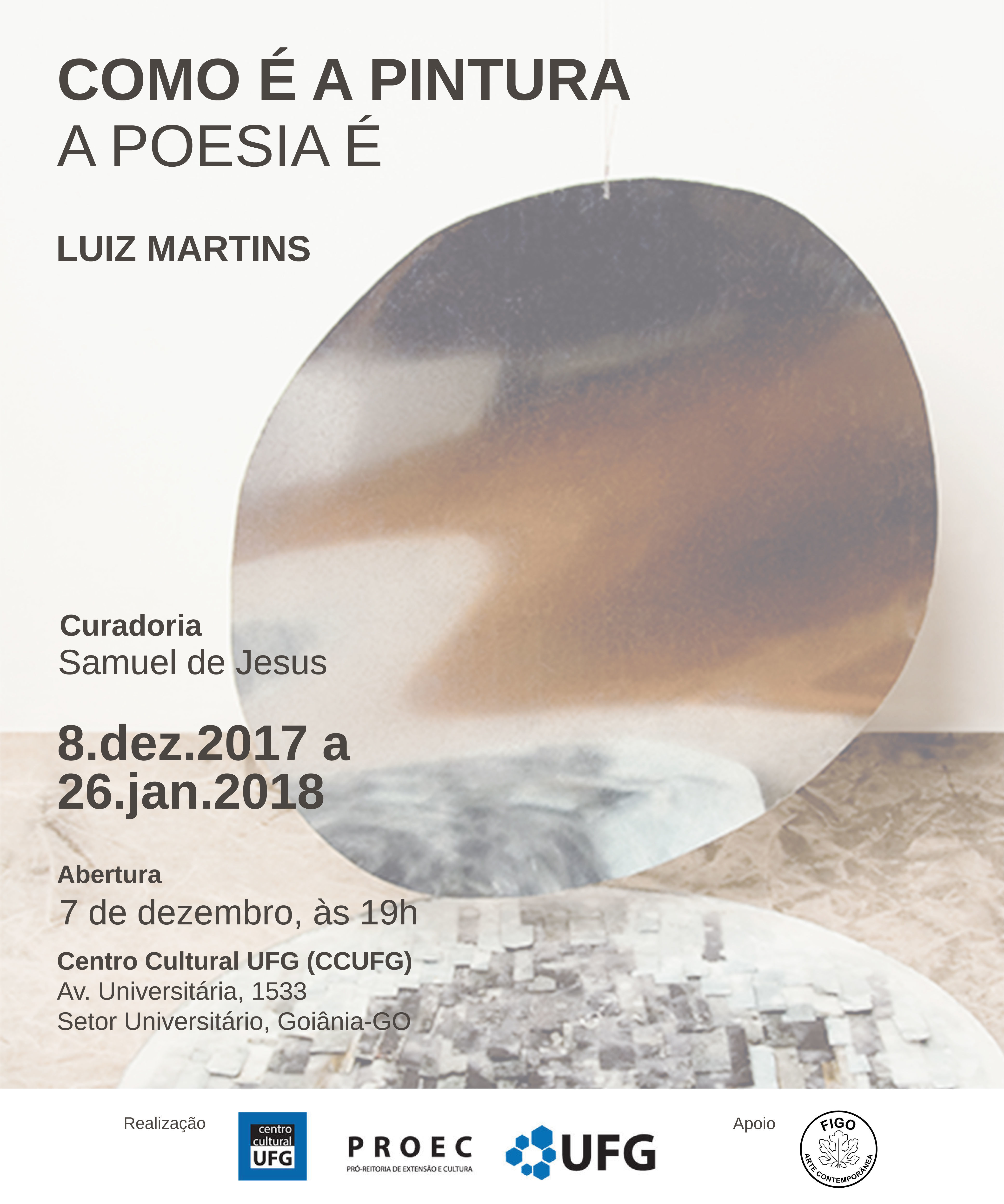 De 8 de dezembro de 2017 a 26 de janeiro de 2018 a Galeria do Centro Cultural UFG (CCUFG) recebe trabalhos do artista plástico mineiro Luiz Martins, na exposição “Como é a pintura, a poesia é”. Vindo de uma temporada de projetos realizados em países como Itália, Áustria e Portugal, ele traz para Goiânia um projeto de leituras visuais que faz uso dos pontos de vista do observador em interação de sentidos e reflexões variadas.