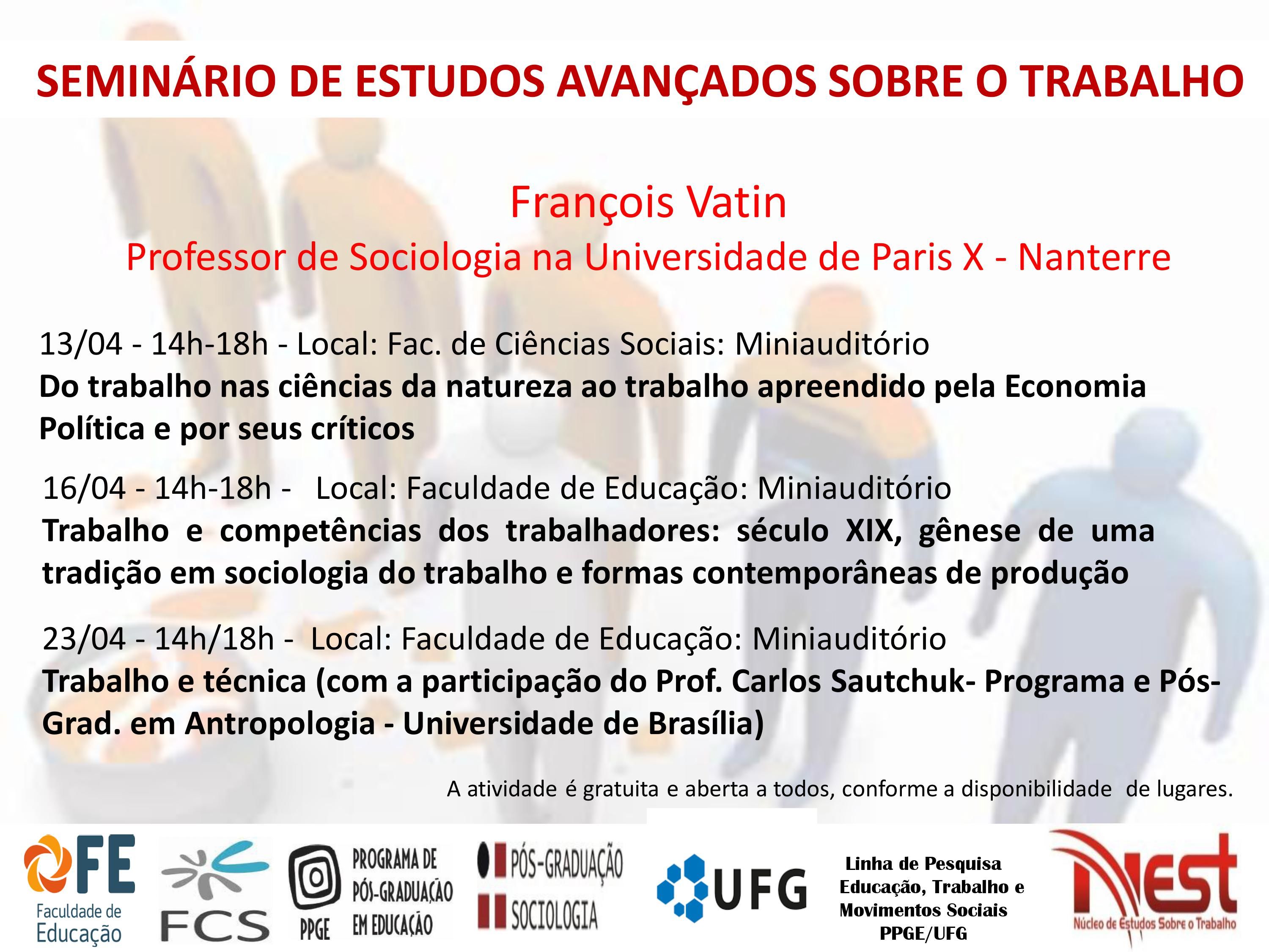O Professor de Sociologia da Universidade de Paris X - Nanterre, François Vatin, especialista em sociologia do trabalho, epistemologia do trabalho e história econômica, vai participar do Seminário de Estudos Avançados sobre o Trabalho na Universidade Federal de Goiás. O evento vai ocorrer na Faculdade de Ciências Sociais e na Faculdade de Educação, entre os dias 13 e 23 de Abril.
