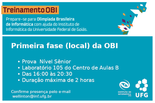 A Universidade Federal de Goiás (UFG) vai sediar a primeira fase local da Olimpíada Brasileira de Informática (OBI). A prova será aplicada nesta quinta-feira (17), no laboratório da sala 105, do Centro de Aulas B, no câmpus Samambaia. A prova tem duração máxima de duas horas e o laboratório estará disponível entre as 16h e as 20h30. Os participantes terão a flexibilidade de começar às 16h ou mais tarde, conforme for mais conveniente.