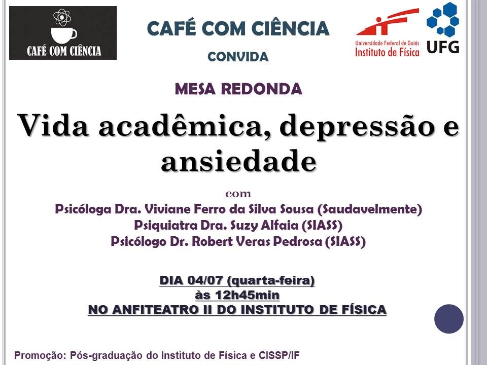 O Programa de Pós-Graduação do Instituto de Física (IF) da UFG e a Comissão Interna de Saúde do Servidor Público (Cissp) do Instituto de Física da UFG convidam para uma mesa redonda sobre Vida Acadêmica, Depressão e Ansiedade. A atividade faz parte do projeto Café com Ciência. Os convidados da mesa são a psicóloga do Programa Saudavelmente, Dra. Viviane Ferro da Silva Sousa, a psiquiatra do Subsistema Integrado de Atenção à Saúde do Servidor (Siass/UFG), Dra. Suzy Alfaia, e o psicólogo do SIASS, Robert Veras Pedrosa. A atividade vai ocorrer na próxima quarta-feira (4), às 12h45, no Anfiteatro II do Instituto de Física da UFG.