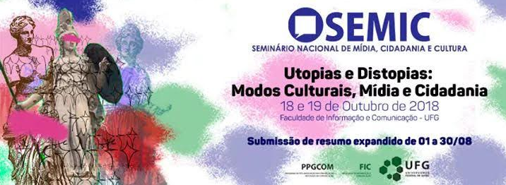 O Programa de Pós-Graduação em Comunicação da UFG infomra as datas  para a realização do 12º Seminário Nacional Mídia Cidadania e Cultura (SEMIC), o evento ocorrerá nos dias 18 e 19 do mês de outubro, na Faculdade de Comunicação e Informação da UFG, Câmpus Samambaia.