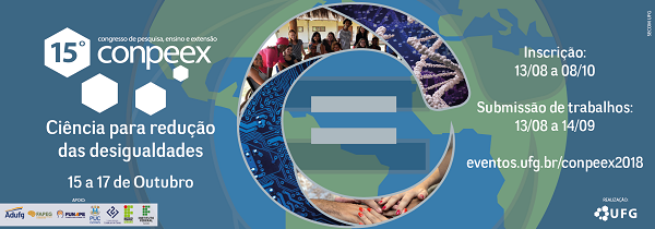 A Universidade Federal de Goiás (UFG) realiza, de 15 a 17 de outubro, seu 15º Congresso de Pesquisa, Ensino e Extensão (Conpeex). A programação geral ocorrerá no Centro de Eventos Professor Ricardo Freua Bufáical, no Câmpus Samambaia, e as atividades complementares serão realizado, além do Centro de Eventos, nas unidades acadêmicas, no Cepae e nos órgãos da instituição.