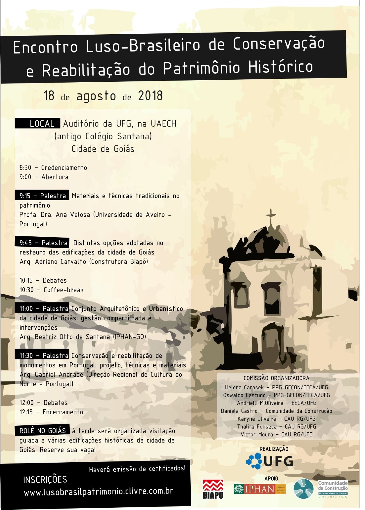 O evento acontecerá na cidade de Goiás, no auditório da UFG, na UAECH (antigo Colégio Santana) e conta com o apoio do Instituto do Patrimônio Histórico e Artístico Nacional (Iphan), Construtora Biapó e Comunidade da Construção. O objetivo do encontro é aprofundar o debate acerca da relevância da Conservação e Reabilitação do Patrimônio Histórico na cidade de Goiás e em Portugal.