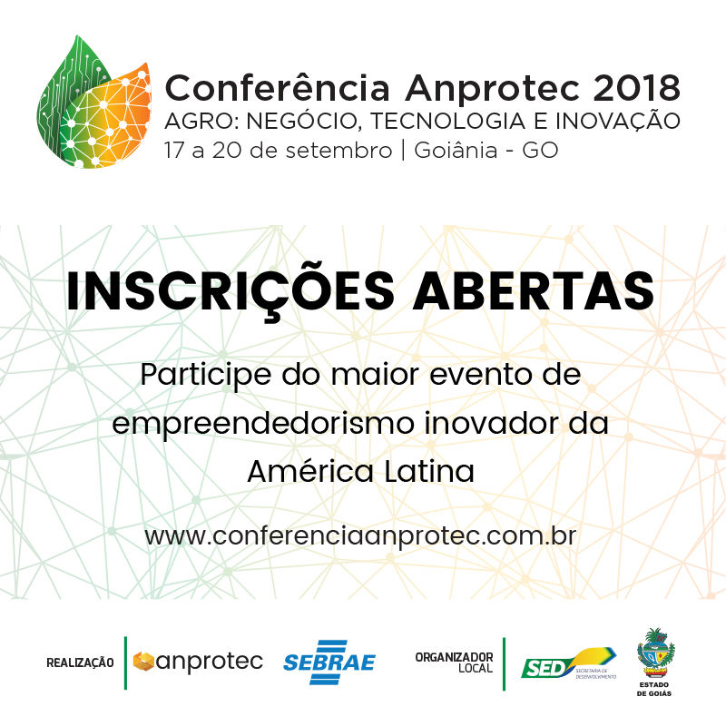 Realizada pela Anprotec e pelo Sebrae, e com o tema "Agro: Negócio, Tecnologia e Inovação", a Conferência Anprotec 2018 tem como organizadora local a Secretaria de Estado de Desenvolvimento Econômico, Científico e Tecnológico e de Agricultura, Pecuária e Irrigação (SED), do Governo do Estado de Goiás, com apoio institucional da Universidade Federal de Goiás (UFG).