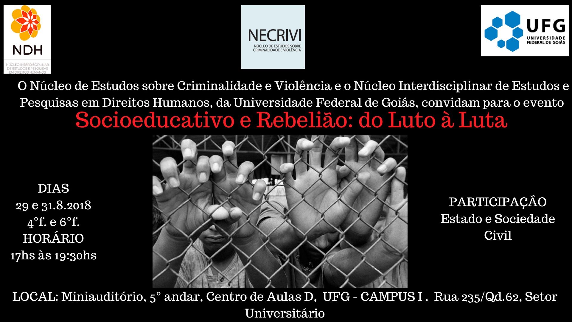 O evento "Socioeducativo e Rebelião: do luto à luta", promovido pelo Núcleo de Estudos sobre Criminalidade e Violência e pelo Núcleo Interdisciplinar de Estudos e Pesquisas em Direitos Humanos, ambos da Universidade Federal de Goiás (UFG), marca os 3 meses da morte de 10 adolescentes internados no Centro de Internação Provisória, localizado no 7° Batalhão da Polícia Militar, discutindo a situação do sistema socioeducativo no estado de Goiás, as condições vivenciadas por adolescentes inseridos nesse sistema e, em particular, as ações do Estado e as propostas da sociedade civil frente à morte dos adolescentes.