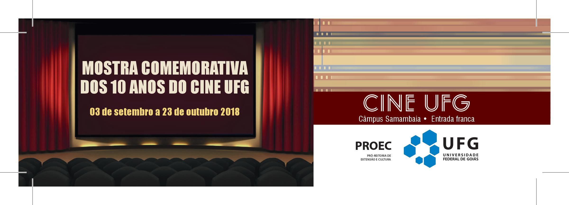 O CINE UFG, coordenado pela Pró-reitoria de Extensão e Cultura da Universidade Federal de Goiás (Proec-UFG),  comemora, em 2018, seus dez anos com exibição de uma Mostra Comemorativa dedicada exclusivamente à produção goiana recente. A mostra vai ocorrer no período de 03 de setembro a 23 de outubro, com sessões às 12h e às 17h, e entrada gratuita. Serão exibidos dez longas metragens e 22 curtas.