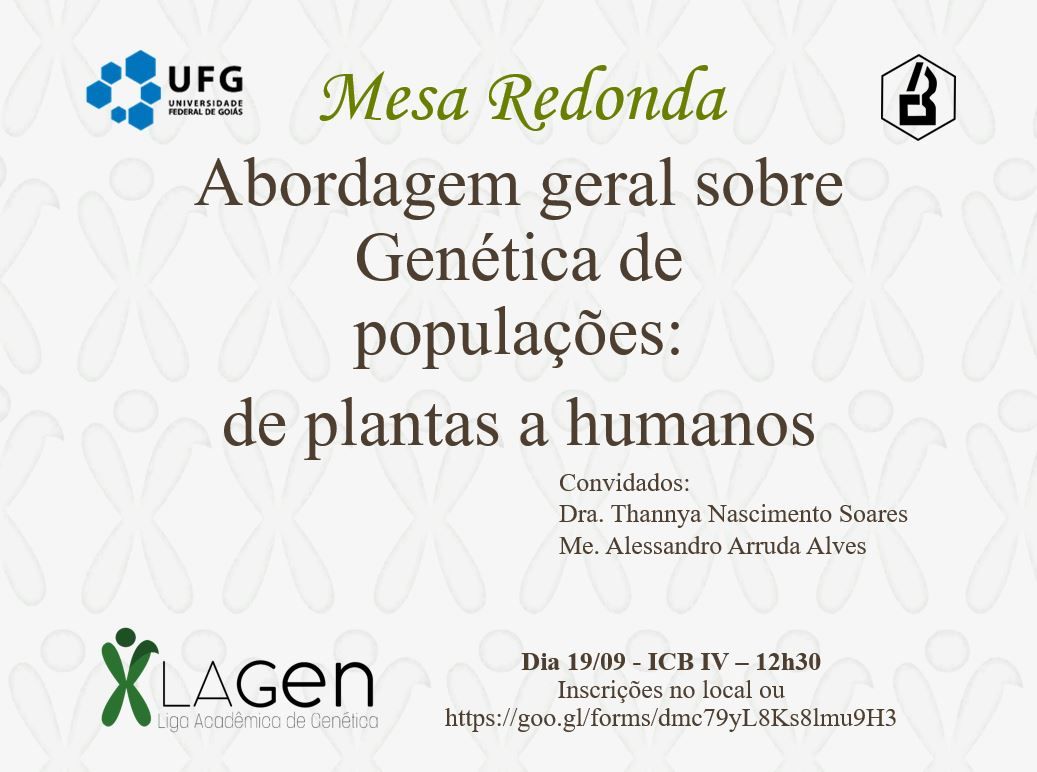 A Liga Acadêmica de Genética (LAGen/ICB/UFG) convida a comunidade acadêmica para participar do Circuito de Mesas Redondas e Palestras da LAGen 2018/2. Os convidados dessa vez serão: Dr. Thannya Nascimento Soares (Introdução à genética de populações e genética de populações vegetal) e Me. Alessandro Arruda Alves (genética de populações humana).