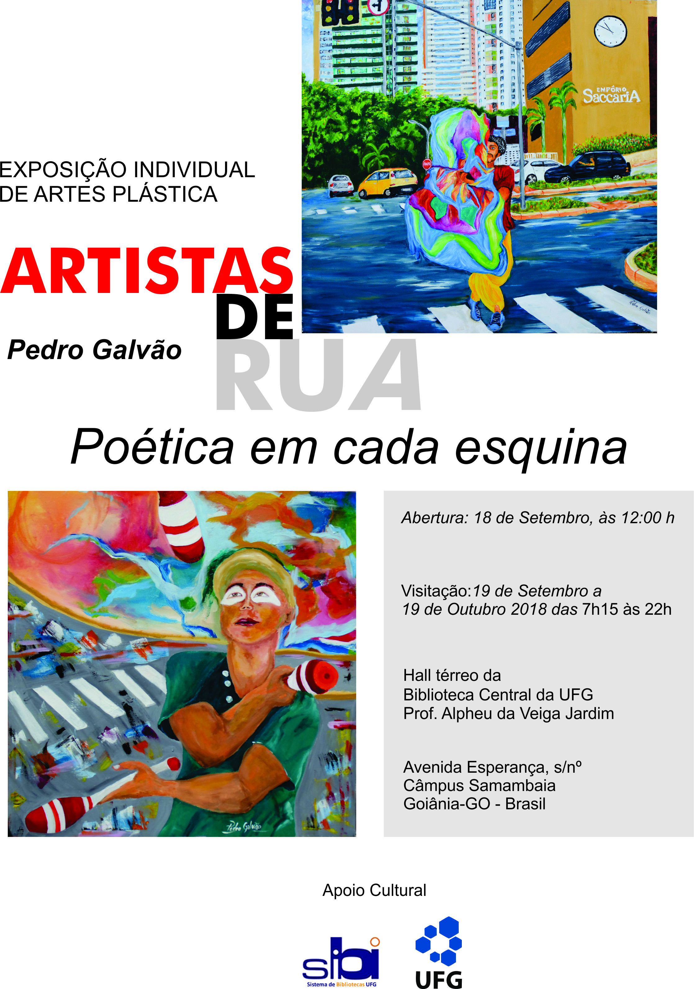 A Biblioteca Central da UFG abre, no dia 18 de setembro às 12 horas, a exposição Artistas de rua: poética em cada esquina, de Pedro Galvão, no hall térreo da Biblioteca Central, que contará com a apresentação do quarteto de violonistas composto por Tayro Louzeiro, André Marcílio, Renan Machado e Mario Sales, alunos da EMAC que fazem parte do projeto "Aluno em Foco", coordenado pela professora Denise Zorzetti.