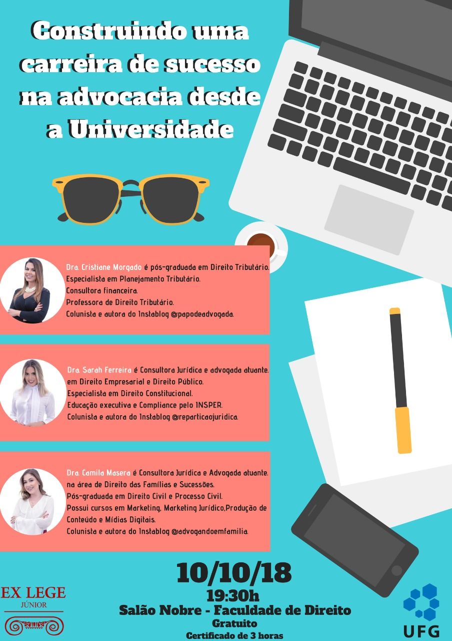 A Empresa Júnior da Faculdade de Direito da UFG está promovendo o evento "Construindo um futuro de sucesso desde a Universidade". A ação vai ocorrer na Faculdade de Direito, no dia 10 de outubro, às 19:30.