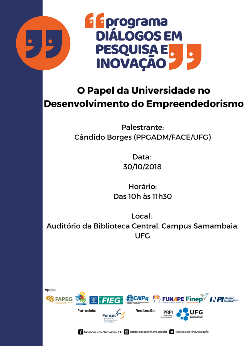A Pró-Reitoria de Pesquisa e Inovação (PRPI/UFG), no âmbito do Programa Diálogos em Pesquisa e Inovação, convida a todos para a palestra: O Papel da Universidade no Desenvolvimento do Empreendedorismo.