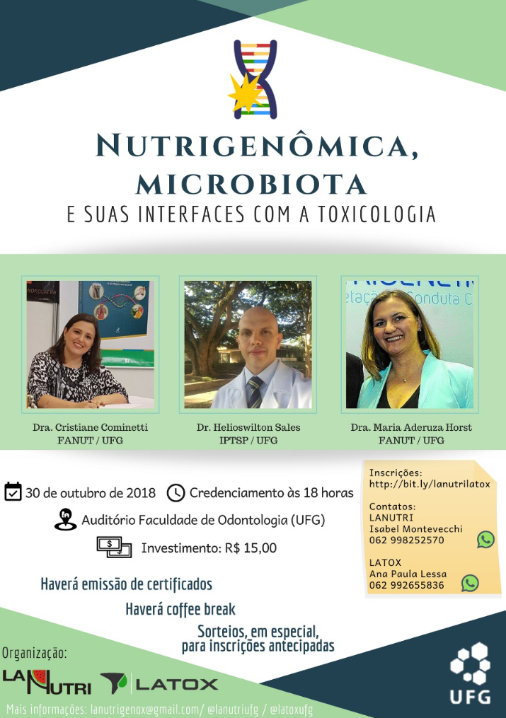 A Liga Acadêmica de Toxicologia e a Liga Acadêmica do curso de Nutrição da Universidade Federal de Goiás (UFG) vão realizar uma palestra sobre nutrigenômica, microbiota  e suas interfaces com a toxicologia.