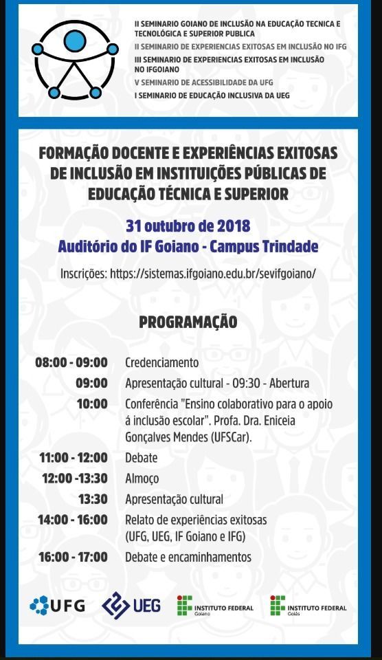 As Instituições de Educação Técnica e Tecnológica e Superior Pública de Goiás, por meio do Núcleo de Apoio Pedagógico e Inclusão Social do IF Goiano (SAPIS/IFGoiano), do Sistema Integrado de Núcleos de Acessibilidade (SINACE - UFG), da Coordenação Direitos Humanos e Diversidade (UEG) e o Núcleo de Ações Inclusivas (IFG) organizam o II Seminário Goiano De Inclusão na Educação Técnica e Tecnológica e Superior Pública de Goiás, que acontecerá na cidade de Trindade, no dia 31 de outubro, no auditório do IF Goiano - Campus Trindade. Interessados devem se inscrever pela internet.