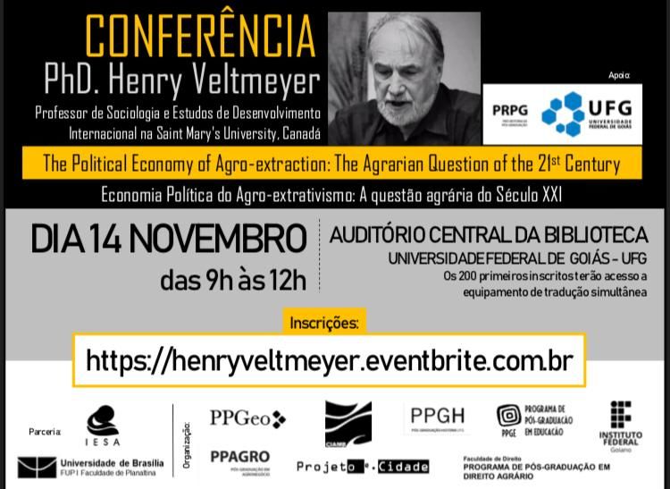 A conferência tem como objetivo debater, a partir da experiência do Dr. Henry Veltmeyer, Professor de Sociologia e Estudos de Desenvolvimento Internacional na Saint Mary's University, Halifax-Canadá, a relação entre a Economia Política do Agro-extrativismo e a questão agrária do Século XXI. Os 200 primeiros inscritos receberão equipamento de tradução simultânea. Clique aqui para se inscrever.
