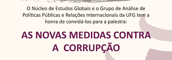 O Núcleo de Estudos Globais e o Grupo de Análise de Políticas Públicas e Relações Internacionais da UFG promovem, no dia 6 de dezembro, às 10h30, palestra com o tema As novas medidas contra a corrupção. A palestra será realizado no auditório da Faculdade de Letras e será ministrada pela representante da Transparência Internacional Brasil, Ana Luiza Aranha.