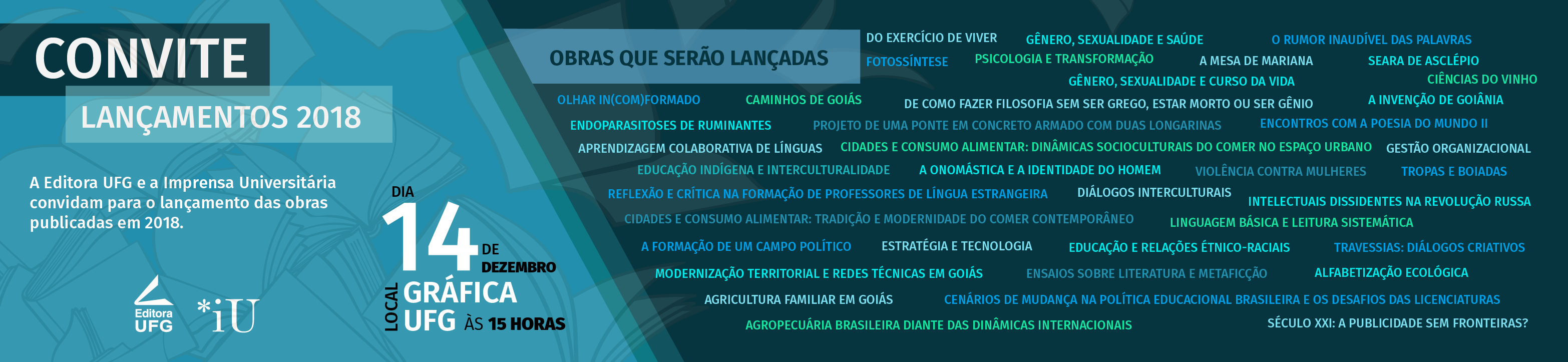 No dia 14 de dezembro, entre as atividades de comemoração do aniversário de 58 anos da UFG, serão lançadas as obras publicadas durante o ano de 2018 pela Editora UFG e pela Editora da Imprensa Universitária. Ao todo, serão lançadas 38 obras. O evento ocorre às 15h, nas oficinas gráficas do Centro Editorial e Gráfico da UFG (CEGRAF).