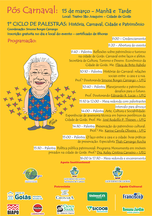 O I Ciclo de Palestras: História, Carnaval, Cidade e Patrimônio, é uma ação de educação patrimonial que faz parte da programação do projeto do Carnaval do Largo do Rosário 2019, da artista plástica Rossana Almeida Roriz da Veiga Jardim, a se realizar na Cidade de Goiás, pelo Programa Estadual de Incentivo à Cultura – Lei Goyazes. O primeiro ciclo de palestras é organizado pela Profa. Me. Simone Borges Camargo de Oliveira, doutoranda pela Pós-Graduação em História da UFG-GO. A ação tem como objetivo geral contribuir para a construção do conhecimento mediante a educação patrimonial, de forma transdisciplinar. Como objetivo específico pretende oferecer subsídios para construir pluralidades na proposição de temas e debates sobre a história, cidade, patrimônio cultural, urbanismo, planejamento urbano, arquitetura, educação, em sua história presente – passado – futuro, através das manifestações culturais dos vários grupos sociais, como possibilidade de uma abertura para mediações de proposições de projetos, ações e soluções presentes e futuras, para a cidade de Goiás.