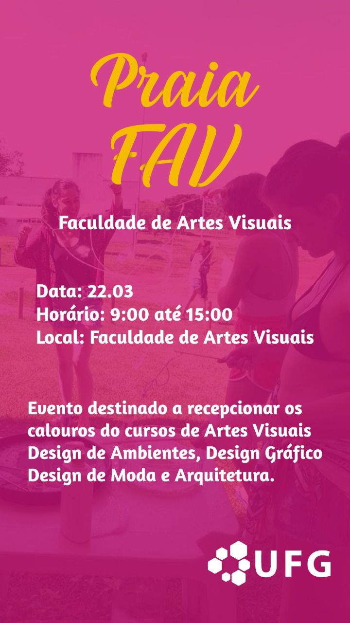 Os novos estudantes da Faculdade de Artes Visuais (FAV) estão convidados a participar do evento de recepção Praia FAV, que será realizado no dia 22 de março no espaço aberto na área externa da faculdade.