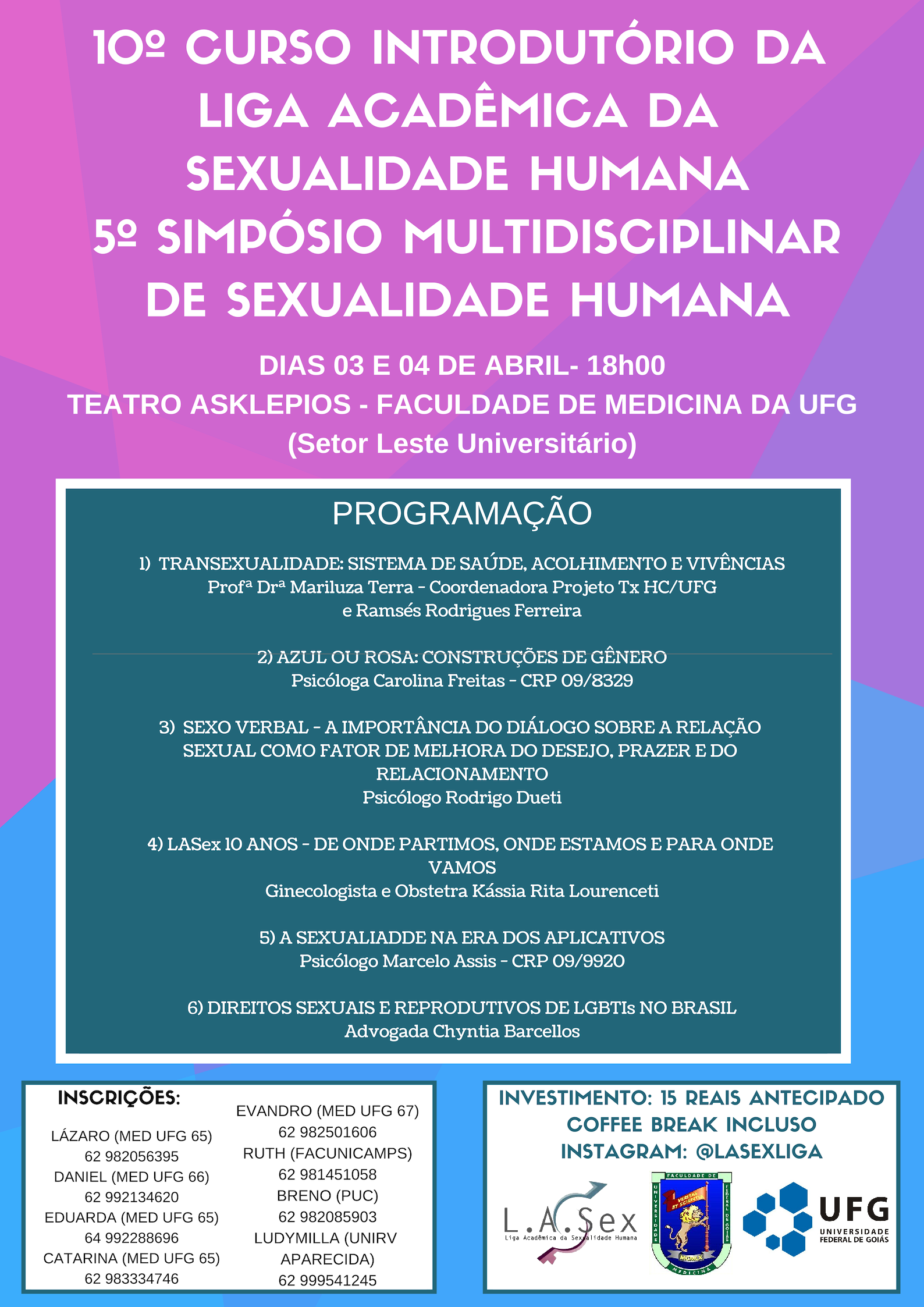 V Simpósio Multidisciplinar de Sexualidade Humana e X Curso Introdutório da LASex Evento Local: Teatro Asklepíos da Faculdade de Medicina da UFG Período do Evento : 03 a 04 de Abril 2019 TweetWhatsApp Listar Todas Voltar