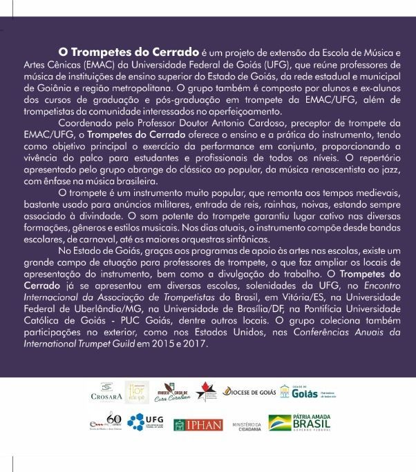 O grupo Trompetes do Cerrado se apresenta no dia 20 de abril, às 18 horas, no tradicional concerto de páscoa na Igreja do Rosário, na Cidade de Goiás. Na ocasião, o grupo irá apresentar repertório da música popular brasileira. A entrada é franca!