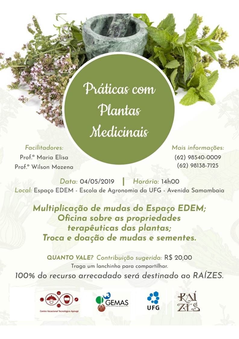 Oficina: Práticas com plantas medicinais Evento Local: Espaço EDEM - Escola de Agronomia da UFG Data do Evento : 04 de Maio 2019 às 14:00 TweetWhatsApp Listar Todas Voltar