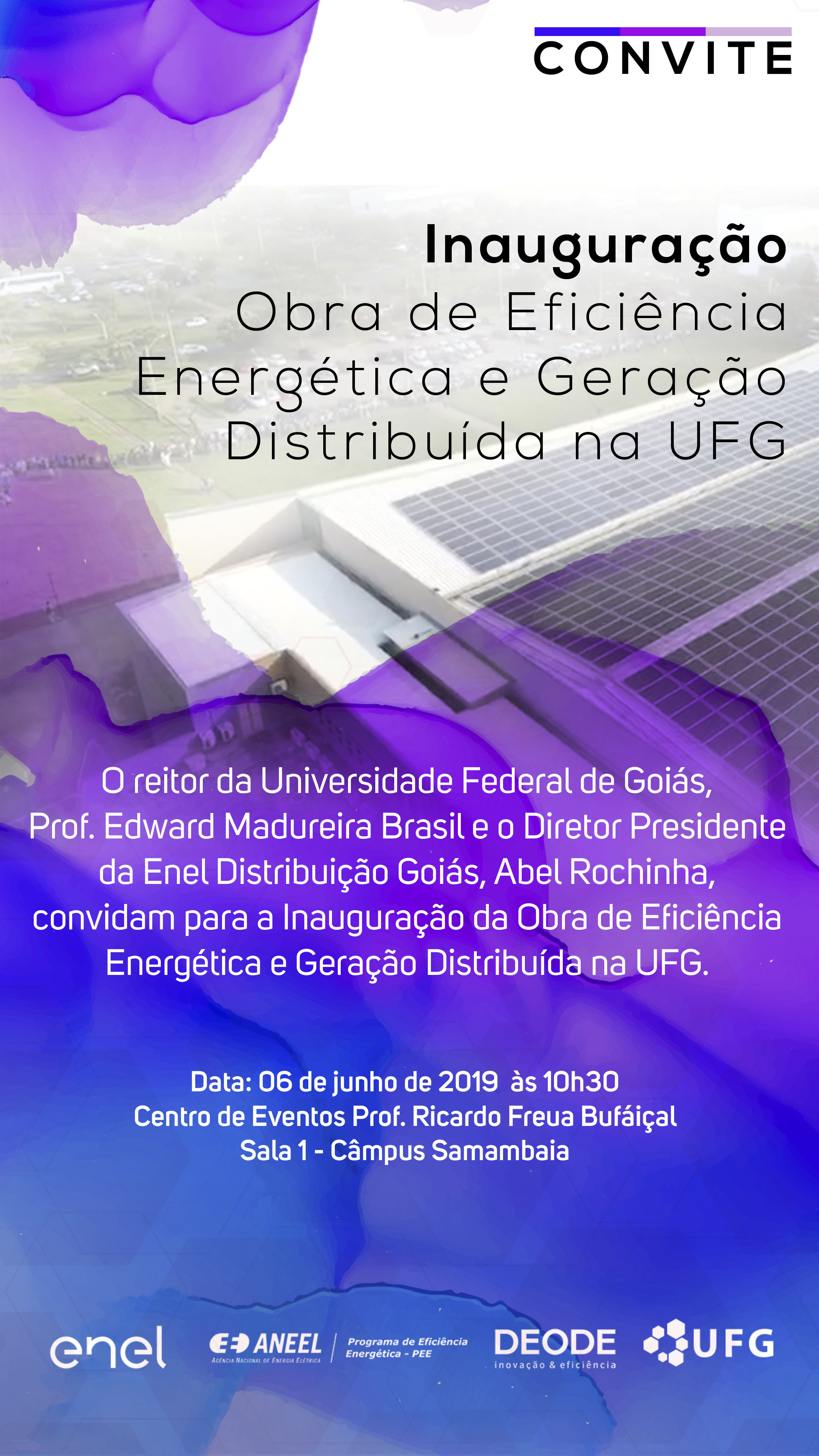 Inauguração da Obra de Eficiência Energética e Geração Distribuída na UFG Evento Local: Sala 1 - Centro de Eventos prof. Ricardo Freua Bufáiçal Fecha del Evento : 06 Junio 2019 a las 10:30 TweetWhatsApp Todas las páginas Volver