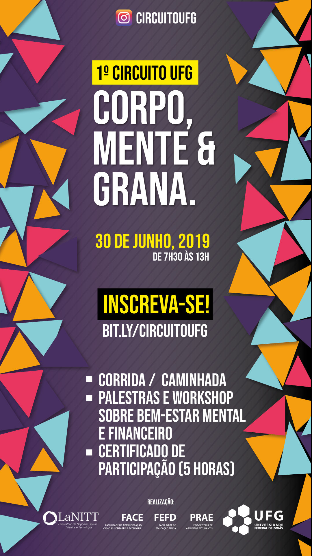 Foi com esse objetivo que surgiu o I Circuito UFG: de corpo mente e grana, exclusivamente voltado para o bem-estar universitário. Previsto para 30 de junho (domingo), das 07h30 às 13h, na Faculdade de Educação Física e Dança da UFG (FEFD/UFG), o evento é organizado pelo Laboratório de Negócios, Ideias, Talentos e Tecnologia da Faculdade de Administração da UFG (LaNITT) e se estrutura em torno desses três pilares: bem-estar físico, mental e financeiro.