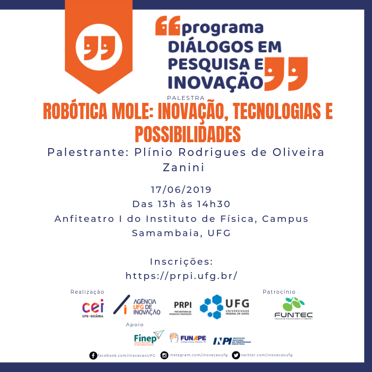 A Pró-Reitoria de Pesquisa e Inovação, no âmbito do Programa Diálogos em Pesquisa e Inovação, convida a todos para a palestra Robótica mole: inovação, tecnologias e possibilidades.
