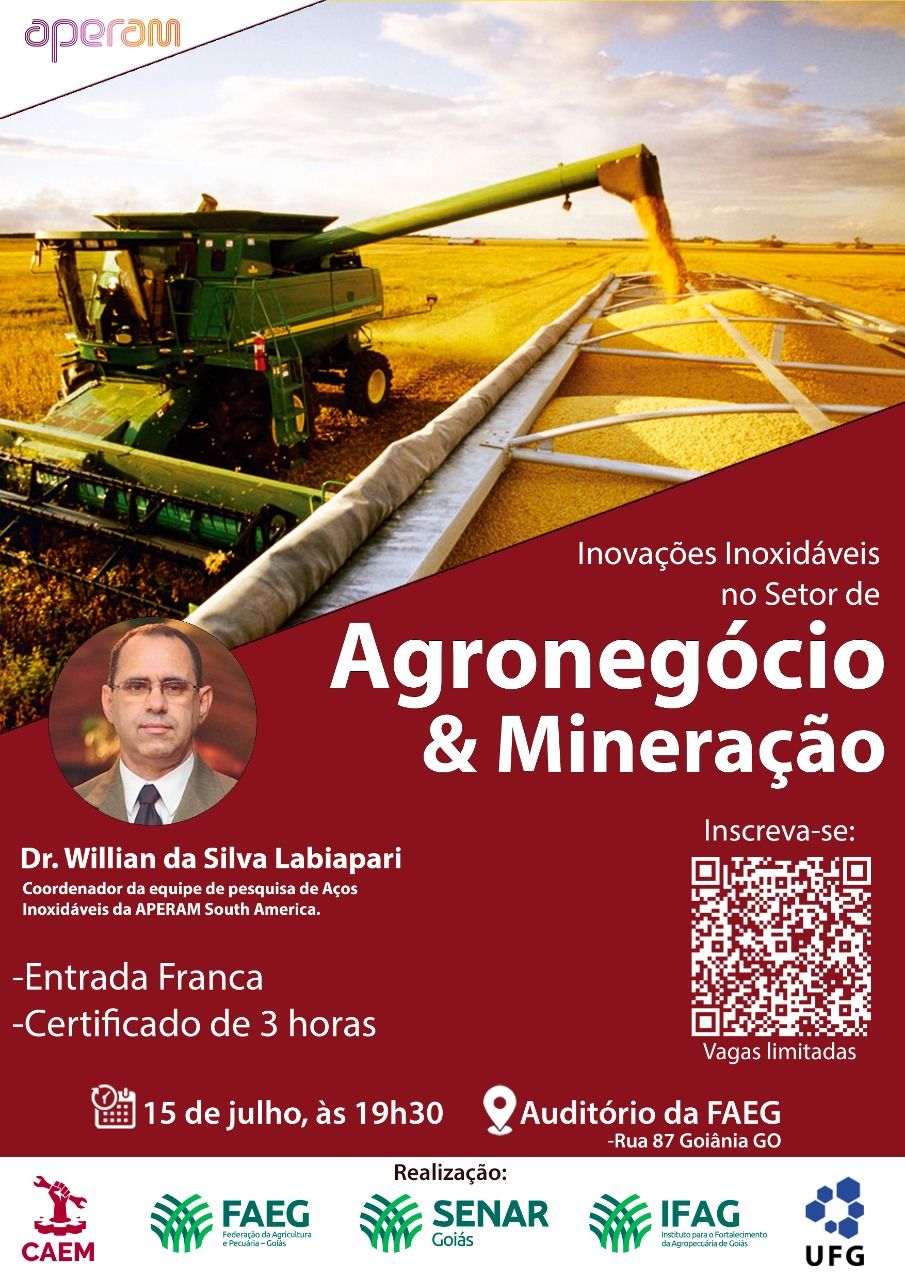 A palestra "Inovações Inoxidáveis no Setor de Agronegócio e Mineração", promovida pelo Centro Acadêmico de Engenharia Mecânica (CAEM/UFG), em parceria com a Federação da Agricultura e Pecuária (FAEG), e Instituto de Fortalecimento da Agropecuária de Goiás (IFAG) ocorre no dia 15 de julho, às 19h30.