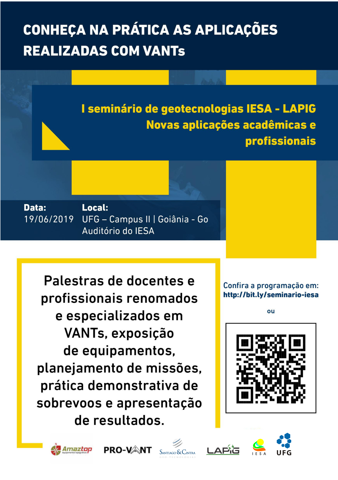 O Instituto de Estudos Socioambientais (IESA), da Universidade Federal de Goiás (UFG), realizará no dia 19 de junho o 1º Seminário de Geotecnologias - Novas aplicações acadêmicas e profissionais. No seminário, serão ministradas palestras e demonstrações práticas sobre Veículos Aéreos Não Tripulados (VANTs, também conhecidos como drones), sensores imageadores, sistemas de navegação por satélite, dentre outros equipamentos relacionados com o tema.