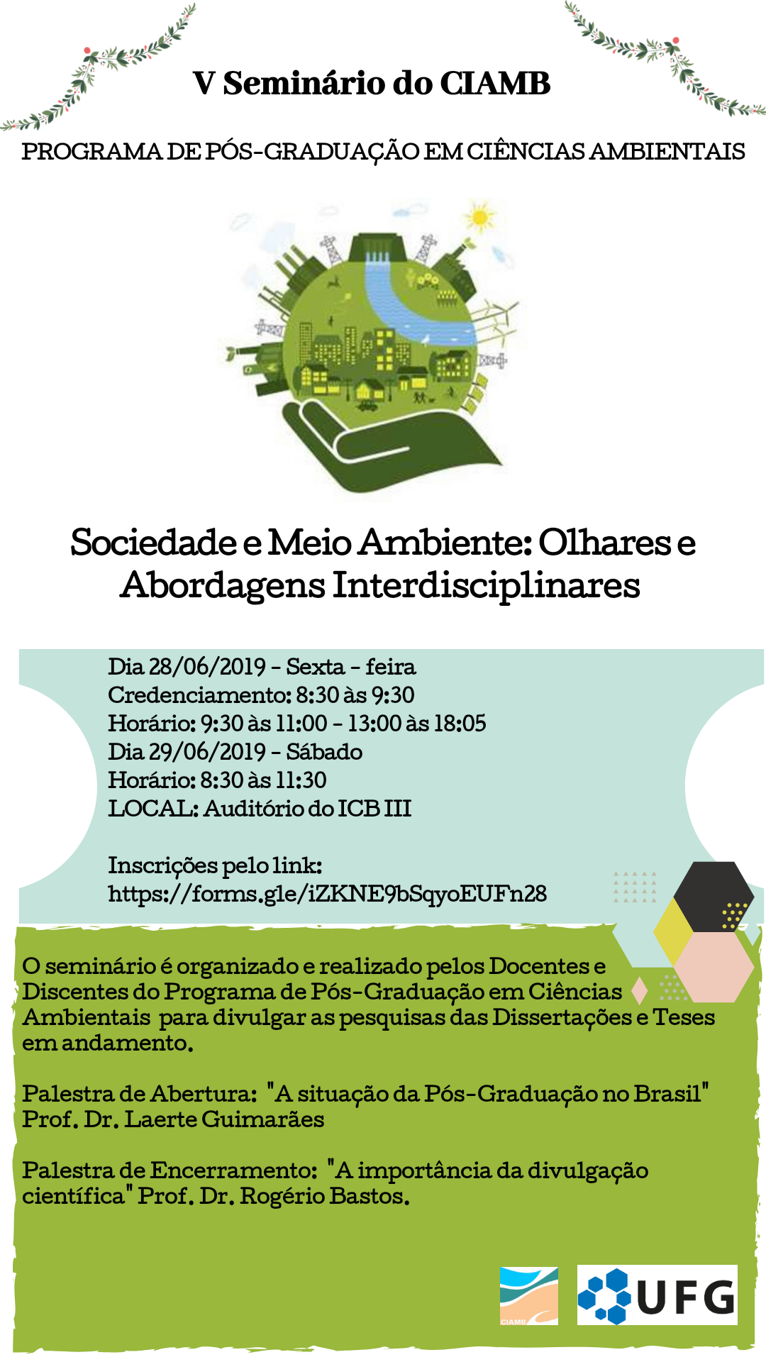 O V Seminário do CIAMB tem o objetivo de integrar docentes e discentes do CIAMB; socializar e discutir os projetos de teses e dissertações; promover espaços de formação e integração científica entre docentes e discentes; ampliar o conhecimento das linhas de pesquisa desenvolvidas pelo CIAMB e buscar parcerias internacionais para o CIAMB. Clique no link do evento para mais informações.