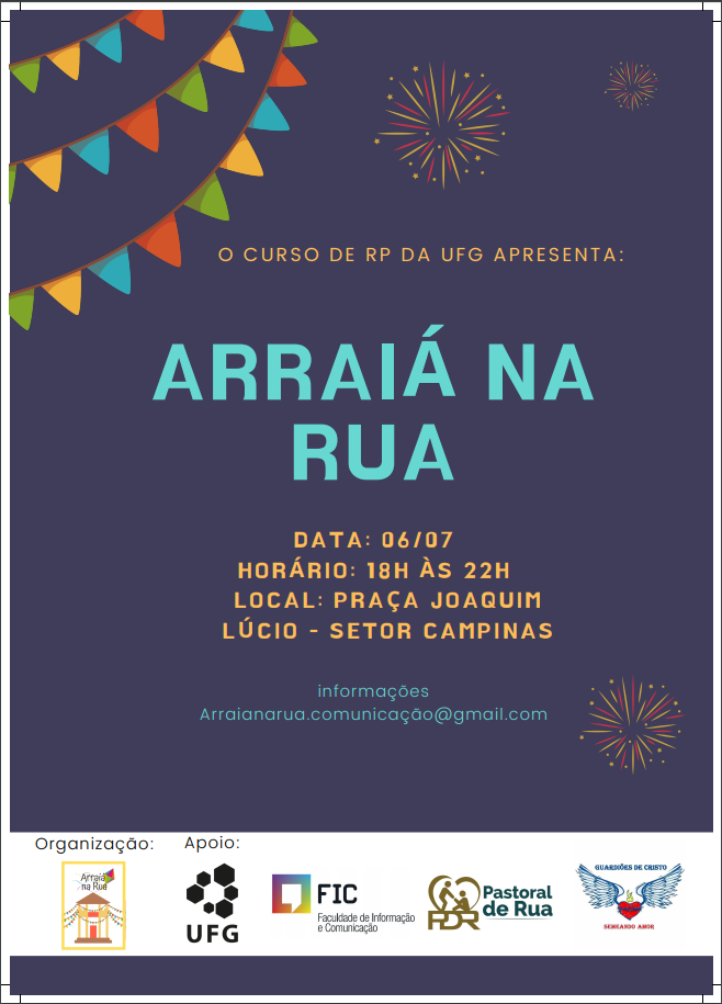 Estudantes do curso de Relações Públicas da Universidade Federal de Goiás (UFG) realizam o evento “Arraiá na Rua”, que tem como público alvo pessoas em situação de rua. O objetivo é proporcionar acesso a lazer e serviços por meio de práticas de cidadania. A atividade ocorre na Praça Joaquim Lúcio, no bairro de Campinas, no dia 06 de julho de 2019, a partir das 18 horas.