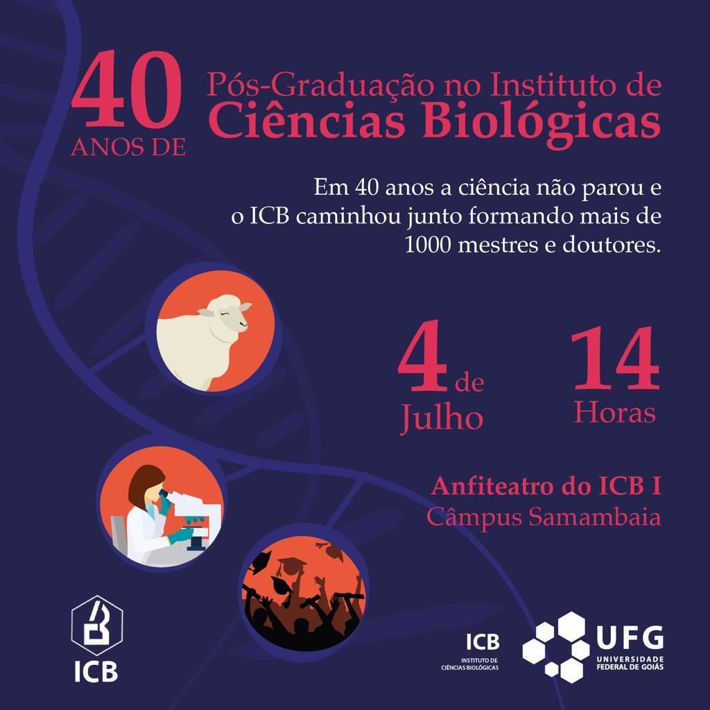 No próximo dia 04, quinta-feira, ocorre um Evento Comemorativo pela formação dos mais de mil Pós-graduandos titulados, incluindo mestres e doutores, no Instituto de Ciências Biológicas da Universidade Federal de Goiás (ICB / UFG). O Instituto de Ciências Biológicas completou em 2018, 50 anos de intensa atividade acadêmica e científica, com serviços relevantes na formação e qualificação em nível de graduação de milhares profissionais nas áreas biológicas, agrárias, veterinárias e de saúde.
