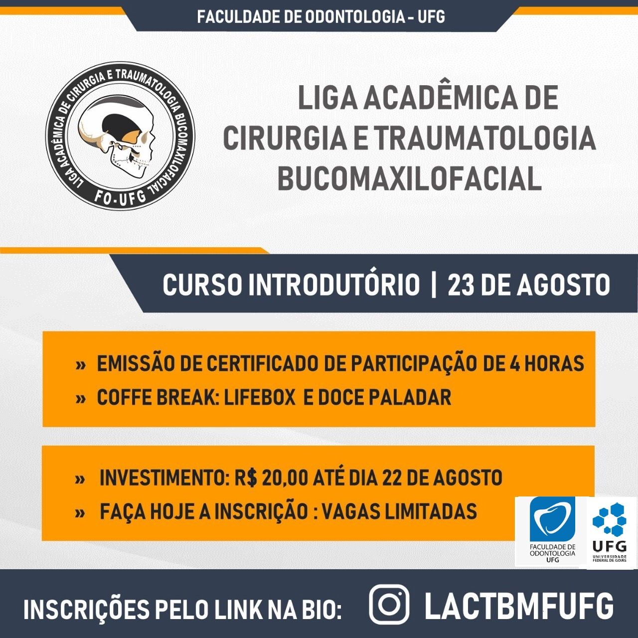 Curso introdutório da Liga Acadêmica de Cirurgia de Traumatologia Bucomaxilofacial Event Local: Faculdade de Odontologia/UFG Event date : September 23, 2019 d TweetWhatsApp List all Back