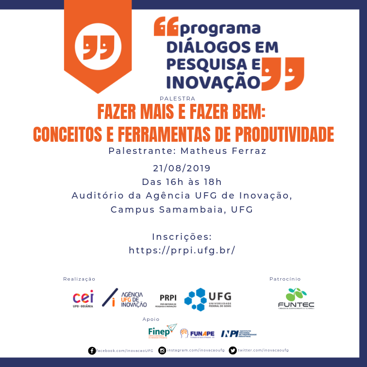 A Pró-Reitoria de Pesquisa e Inovação, no âmbito do Programa Diálogos em Pesquisa e Inovação em parceria com o Centro de Empreendedorismo e Incubação, convida a todos para a palestra Fazer Mais e Fazer Bem: conceitos e ferramentas de produtividade.