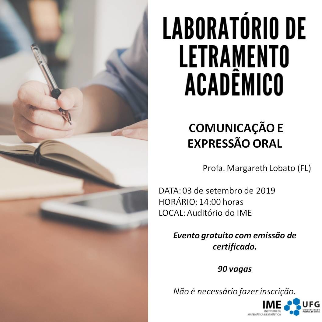 No dia 03 de setembro acontece a primeira atividade do projeto de ensino "Laboratório de Letramento Acadêmico", coordenado pelo professor Fabiano Fortunato Teixeira dos Santos (IME). A oficina de "Comunicação e Expressão Oral" será ministrada pela professora Margareth Cavalcante de Castro Lobato (FL), às 14:00 horas, no auditório do Instituto de Matemática e Estatística (IME). O evento é gratuito e serão emitidos certificados de participação.