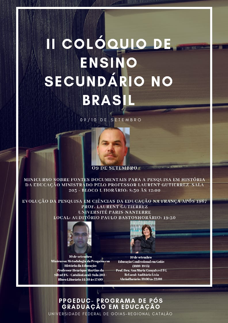A Regional Catalão da Universidade Federal de Goiás (UFG) promove o II Colóquio de Ensino Secundário no Brasil, que ocorre nos dias 09 e 10 de setembro. Acesse o site do evento para se inscrever e conferir a programação.