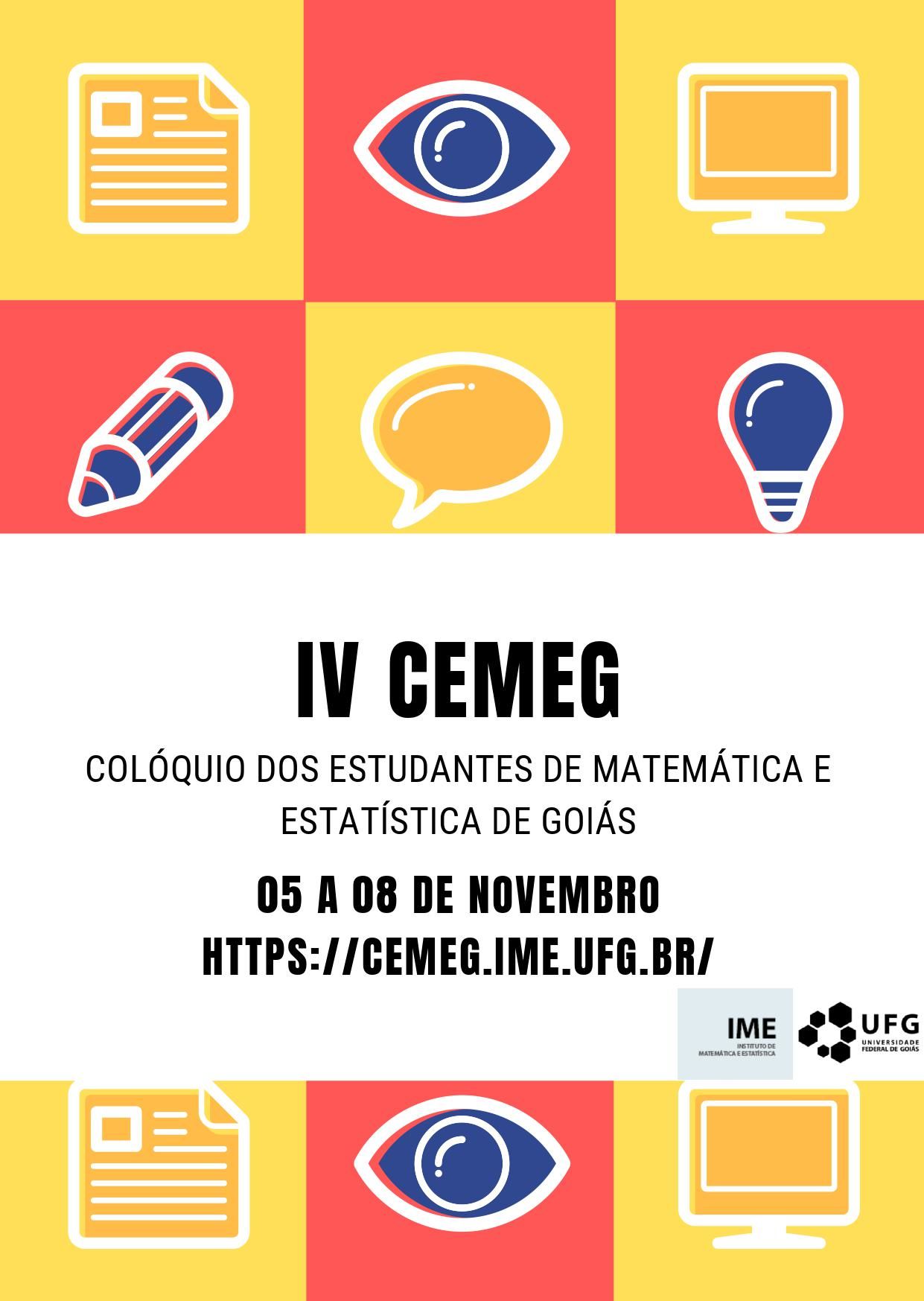 O IV Colóquio dos Estudantes de Matemática e Estatística de Goiás será realizado de 05 a 08 de novembro de 2019, no Instituto de Matemática e Estatística (IME) da Universidade Federal de Goiás (UFG).