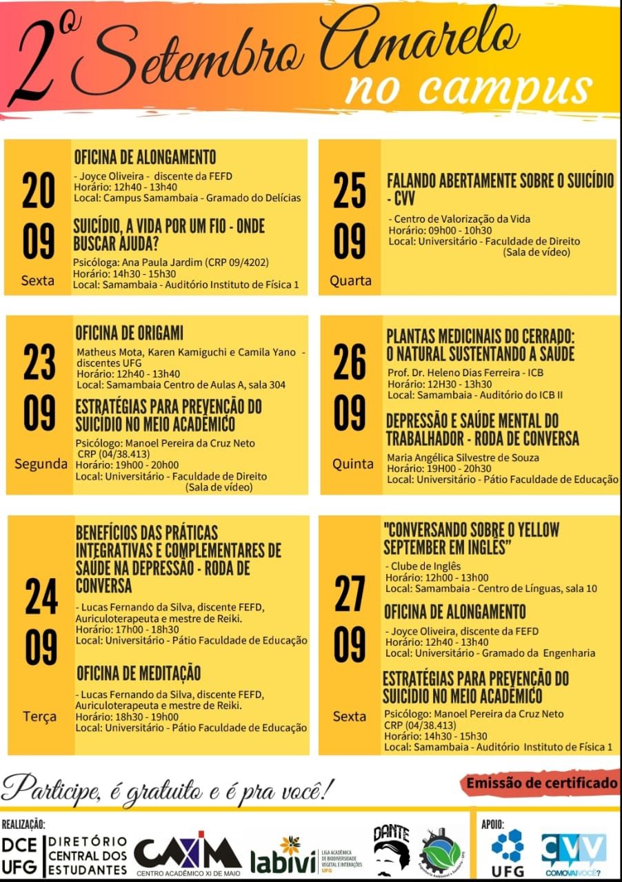 Setembro Amarelo no Câmpus Evento Local: Câmpus Colemar Natal e Silva e Câmpus Samambaia Período do Evento : 20 a 27 de Setembro 2019 TweetWhatsApp Listar Todas Voltar