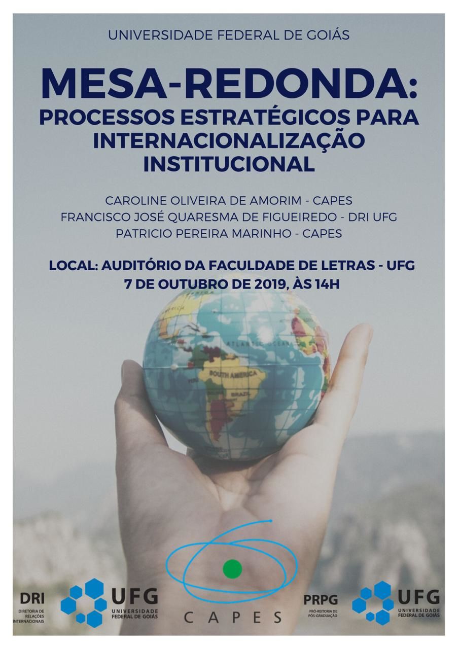 Será realizada no dia 7 de outubro, às 14h, no auditório da Faculdade de Letras da Universidade Federal de Goiás (FL/UFG), a mesa-redonda "Processos estratégicos para internacionalização institucional". Participarão do evento Caroline Oliveira de Amorim (Capes), Francisco José Quaresma (DRI/UFG) e Patricio Pereira Marinho (Capes).