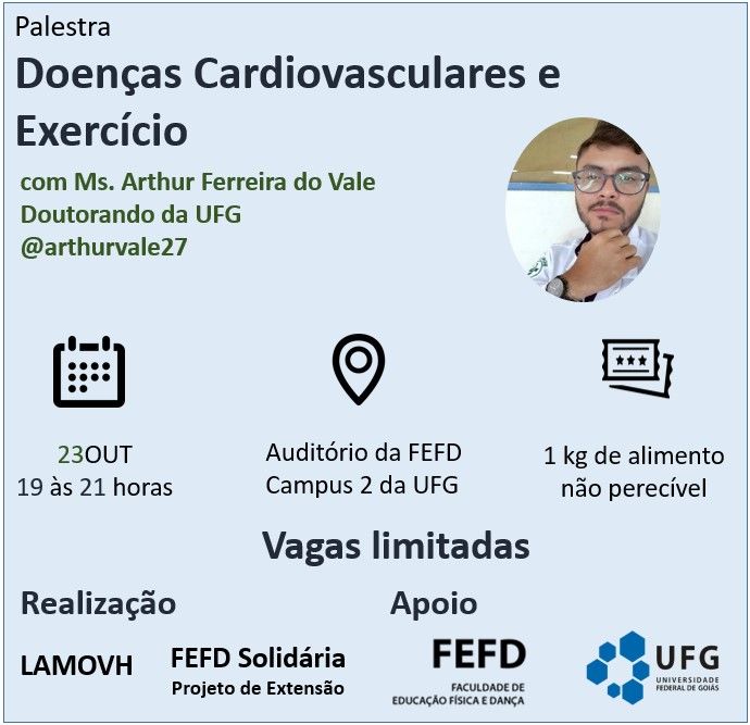 A Faculdade de Educação Física e Dança (FEFD) realiza a palestra “Doenças cardiovasculares e exercício” a ser proferida pelo Prof. Arthur Vale. A palestra faz parte do Projeto de Extensão FEFD Solidária (Faculdade de Educação Física e Dança da UFG).
