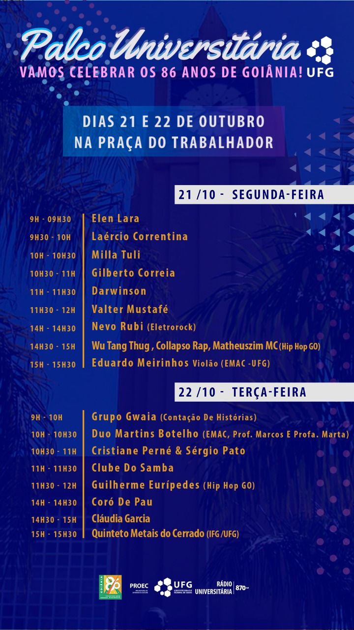Palco Universitária celebra aniversário de Goiânia Événement Local: Praça do Trabalhador Date de l'événement : 21 Outubro 2019 TweetWhatsApp Liste tous Voltar