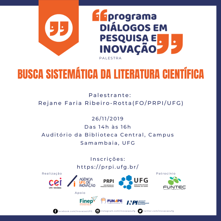 A Pró-Reitoria de Pesquisa e Inovação, no âmbito do Programa Diálogos em Pesquisa e Inovação, convida a todos para a palestra Busca Sistemática da Literatura Científica.