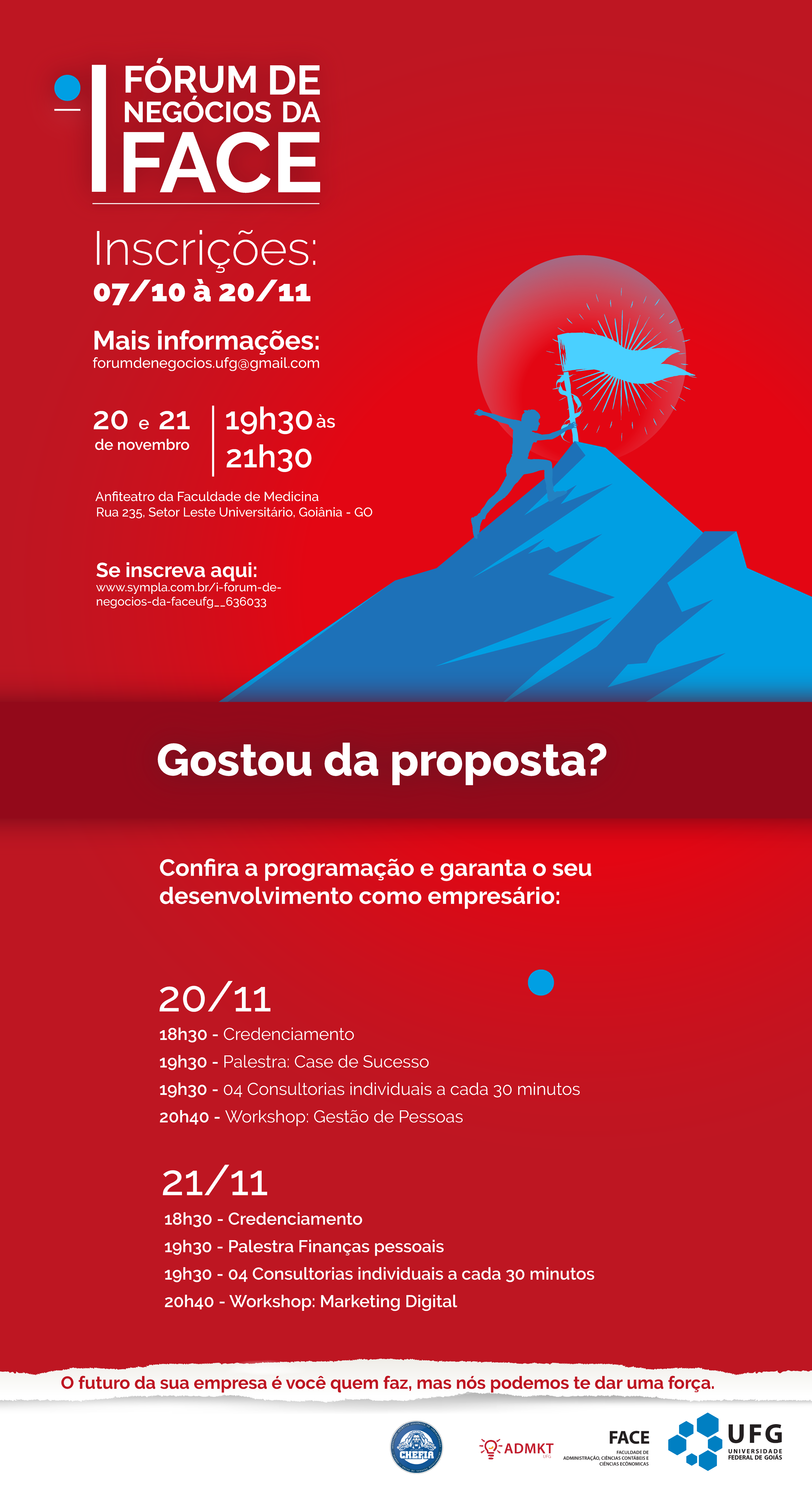 A primeira edição da Feira de Negócios da Faculdade de Administração, Ciências Contábeis e Ciências Econômicas (FACE) tem como objetivo integrar a sociedade goianiense aos cursos de Administração, níveis de Graduação, Especialização, Mestrado e Doutorado. A expectativa é, por meio de consultorias, workshops e palestras, demonstrar o conhecimento gerado pelos alunos e egressos à sociedade.