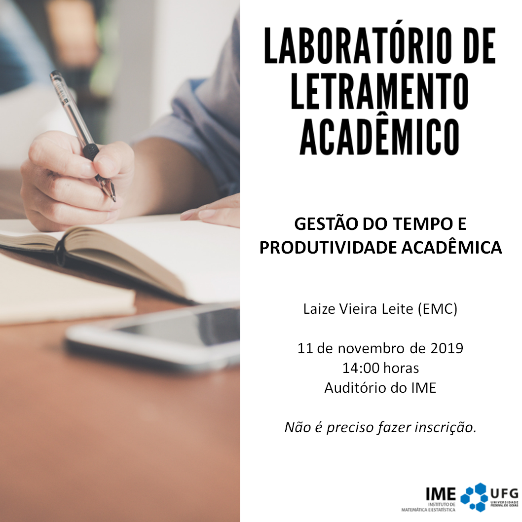 Oficina: Gestão do tempo e produtividade acadêmica Evento Local: Auditório do Instituto de Matemática e Estatística (IME) Data do Evento : 11 de Novembro 2019 às 13:00 TweetWhatsApp Listar Todas Voltar