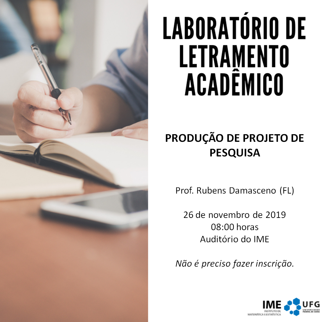 Oficina: Produção de Projeto de Pesquisa Evento Local: Instituto de Matemática e Estatística da UFG Fecha del Evento : 26 Noviembre 2019 a las 07:00 TweetWhatsApp Todas las páginas Volver