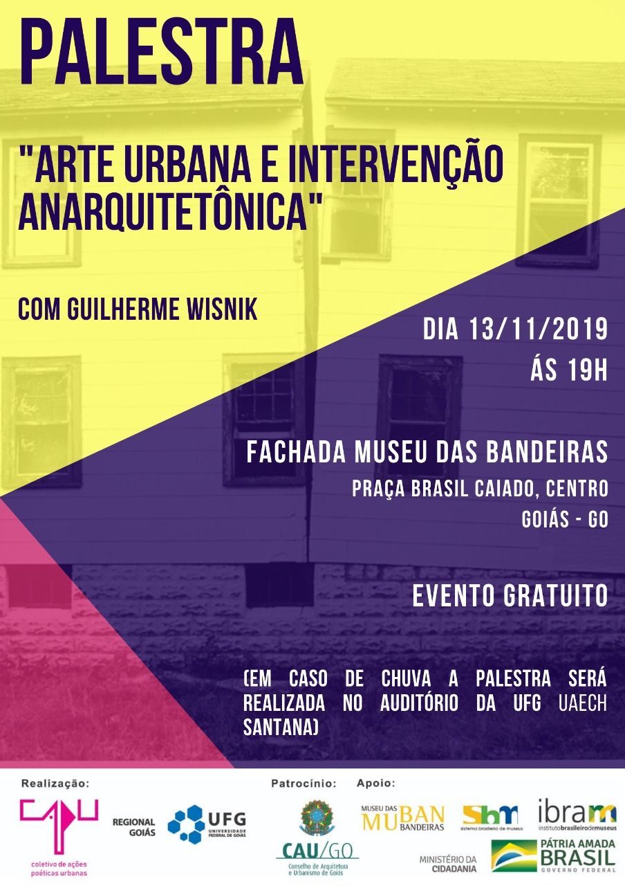 O Coletivo de Ações Poéticas Urbanas (CAPU) abre a exposição "Ações Poéticas Urbanas" com a palestra “Arte urbana e intervenção anarquitetônica”, de Guilherme Teixeira Wisnik, em frente ao Museu das Bandeiras, no dia 13 de novembro, às 19h. Wisnik é livre-docente na Faculdade de Arquitetura e Urbanismo da Universidade de São Paulo (FAU-USP), autor de livros como Lucio Costa (Cosac Naify, 2001), Caetano Veloso (Publifolha, 2005) e Estado crítico: à deriva nas cidades (Publifolha, 2009). É membro da Associação Paulista de Críticos de Arte (APCA), da Latin American Studies Association (LASA), e Vice-Diretor do Centro Universitário Maria Antônia da Universidade de São Paulo (CEUMA/USP).